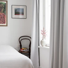 Loomulikult ei puudu interjöörist ka Warm Northi enda toodang, aga üllataval kombel leiab siit vaid paar abilauda ja puidust söögilaua, mis oli selle täispuidust laua esimene prototüüp. Erinevatest ajastutest ja eri stiili toolid laua ümber moodustavad põneva ja eklektilise kollektsiooni. Philippe Starck ja Jasper Morrison seisavad uhkelt kõrvuti sajandialgusest pärit nikerdustega tooli ja nahast põhjaga režissööritoolidega. Söögilauda valgustab 1960ndate Taani firma Form Light valgusti, mis meenutab Louis Poulseni klassikat PH5, kuid sümpatiseeris pererahvale oma lihtsama ja ümarama vormiga enam. Olukord laua ümber iseloomustab ilmekalt ka ülejäänud korteri mööblivalikut – muretu kergusega on kokku miksitud eri ajastute ja stiiliga mööblitükke – nii nüüdisaegset disainiklassikat kui ka antiiki. Köögi- ja vannitoamööbel ning raamaturiiulid tehti korterisse spetsiaalselt disaineri jooniste järgi.