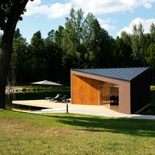 Järve kaldal paiknev grill- ehk teemaja on kujundatud elumajaga samas stiilivõtmes. | foto: Terje UgandiLõuna-Eesti kuppelmaastikul asuvale väikese järve, metsatuka ja allikaga maalilisele krundile on kerkinud Lauri Nõmme (Design Police Department OÜ) kavandatud efektne eramu. Peale peamaja kuuluvad kompleksi teemaja, periskoobikujuline kasvuhoone ja välitualett ning maapinnast välja «kasvav» betoonist varjualune.