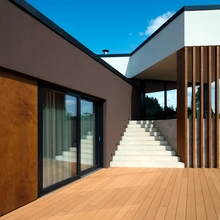 Elumaja sokliosa on monteeritavatest raudbetoonplokkidest, mis on jäetud katmata, ülejäänud fassaad on krohvitud kahes toonis: tumepruuniks ja valgeks. Aktsenti lisavad Prodema ProdEXi naturaalse puiduspooniga fassaadipaneelid. Mitme viimistluse kombineerimine toob esile mängu eri mahtude ja tasanditega ning toonitab maja omanäolist vormilahendust.