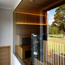 Maja keskel paiknevad avatud elu- ja söögituba. Siitsamast laskuvad trepid alumisele tasandile, kuhu kavandati avarad saunaruumid. Aktiivse elulaadiga pere armastab külalisi võõrustada ja saunaplokki on loodud mugavad tingimused ka öömajalistele. Peale külalistetoa on sauna eesruumi seinapaneeli taha peidetud väike kööginurk – nii ei pea valamu ja külmiku kasutamiseks korrus kõrgemal asuvasse kööki või vannituppa suunduma.