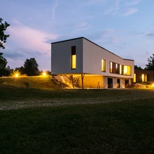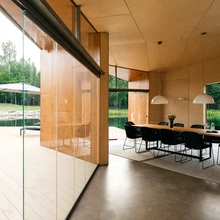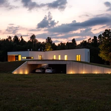 Valgust ja avarust on majas rohkelt ning igal sammul võib pilk rännata imelistele aknast avanevatele vaadetele: ühel pool maja laugetel küngastel sirguvale männinoorendikule, teisel pool tüünele järvele ja selle taustal kõrguvale metsatukale. Sooviga vaateid mitte lõhkuda ja arvestusega, et pere eraldi garaaži ei tahtnud, projekteeriti autodele justkui maapinnast välja «kasvav» varjualune. Monoliitbetoonist vorm on peidetud vahvalt maastikusse, nii et autosid ei näe kohe ei sissesõiduteelt ega elumajast vaadates. Toreda ruumikogemuse pakub ka teekond varjualusest elumajja ehk mööda astmeid künka seest välja tulemine.