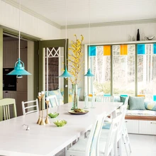 Nii ongi näiteks söögilaua kohal rippuvate valgustite osad leitud kõik majast, olemas olnud lampide detaile on omavahel lihtsalt vahetatud ja kombineeritud ning selle tulemusena saadud valgustid üle värvitud. Pikk laud nende all on aga uus, sest midagi vana polnud kusagilt lihtsalt võtta. Täispikkuses lahti tõmmatuna on see 3,9 meetrit pikk.