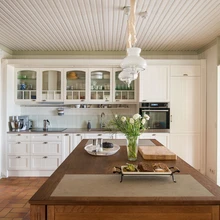 Sellise söögilaua omanikule jäi loomulikult väikeseks olemasolev köök ning ka uut planeerides oli kohe selge, et vaid seinaääri mööda paigutatud moodulitega hakkama ei saada. Jalgadele tõstetud köögisaar, mille ühte jalga mööda on tööpinnani veetud ka elekter, mõjub vaatamata oma suurusele kergelt.