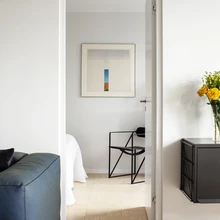 Teadlikult vaadati pigem kehvas olukorras kinnisvara, sest plaanis oli suurem ümberkorraldus. Korter võeti skeletini tühjaks ja ruumi maksimaalseks ärakasutamiseks nihutati köögi ning vannitoa asukohti. Välja vahetati ka kaablid ja täispuidust uksed. Kuigi ruutmeetreid on napilt 50, on korterisse paigutatud kõik vajalikud funktsioonid ja visuaalselt mõjub see tunduvalt avaramana. Igal ruumil on vähemalt kaks otstarvet: magamistuba-garderoob, elu-söögituba, kontor – tulevane lastetuba. Sisearhitektid on loomulikult väga osavad ruumiplaneerijad, nii on iga sentimeeter ruumi säästmiseks läbi joonestatud ja katsetatud. Näiteks vannitoas on pesumasinaukse ja tualettpoti vahel vaid millimeetrite mäng. Ühe avarust ja õhulisust loova võttena tõsteti riiulid ja kapid maast lahti, mis jättis põrandapinna võimalikult vabaks. Ruumisäästlikud on ka seinakapid ja panipaigad, kuhu kõik üleliigse silma alt ära saab peita.