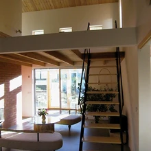 Projekteerisin puitehitise lõunapoolsele küljele kahe korruse kõrguse topeltfassaadi – suure klaaspinna, kuhu peaaegu hommikust õhtuni paistab päike – ja selle taha soojust salvestava saviseina. Selles olevate avade kaudu pääseb õhk ringlema ja kütab siseruume. Päike kütab ka maja vee soojaks.