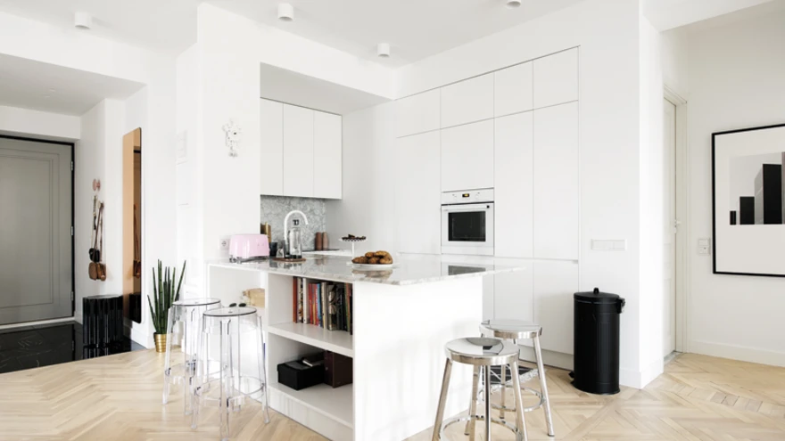 Sisearhitekt Helen Kolksi väärikas eestiaegses kivimajas asuvasse helevalgesse kodusse toovad isikupära ja värvilise elu stiilsed detailid ning disainiklassika. 1930ndate aastate lõpus valminud soliidne elamu Kalamajas kuulub ühe tolle aja edukama arhitekti – Eugen Sachariase – loomingu hulka. Omaaegse üürimaja avarad trepikojad, kõrgete lagedega korterid ja korralik ruumiplaneering räägivad heast eestiaegsest arhitektuurikultuurist.