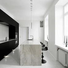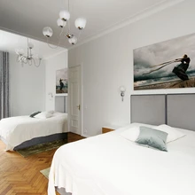 Pilku püüavad hoopis austusega korda tehtud kalasabaparkett, kõrged uksed, laekarniisid ja loomulikult ajastuhõngulisse interjööri veatult sobiv sisustus. Kogu mööbel, välja arvatud diivanid ja toolid, on ühtset stiili ja sümmeetriat silmas pidades valminud sisearhitektide jooniste järgi. Ines Käärma sõnul tuli leida üks läbiv “mööbliidee”, mis läbiks kogu interjööri ja viitaks ajastule omasele stiilile. Siin korteris said selleks kaunis intarsiatehnikas kapiuksed ja ruumi “ära kaduvad” peegellaminaatpindadega garderoobid.
