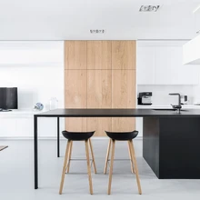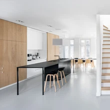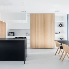 Elutoa ühte pikka seina projekteeriti kõrged sisseehitatud kapid, mis kulgevad ühtses stiilis läbi köögi, elu- ja söögitoa. Igas tsoonis täidavad seinakapid oma kindlat funktsiooni: elutoaosas on lahtised riiulid vaasidele jt aksessuaaridele, koht televiisorile ning sahtlid asjade hoidmiseks. Köögis jäävad tammepaneelide taha köögitehnika ja kõrged köögikapid, söögitoatsoonis avatud riiulid nõudele. Riiulitel eksponeeritu saab vajadusel peita suurte paneelide taha, mis liuglevad siinidel köögist söögituppa ja vastupidi. Erinevate lahtiste mööbliesemete asemel laseb seinatäis kappe mõjuda elutoal puhta ja klaarina.