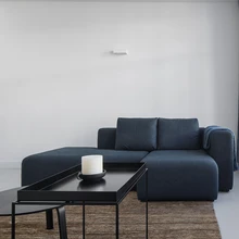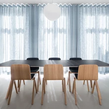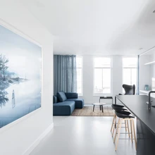 120 ruutmeetri suuruse korteri esimesele tasandile kavandati avatud köögiga avar elutuba, teisele korrusele kaks magamistuba ja vannituba. Kui vaheseinad eemaldati, sai elutoast üks suur avatud ruum, kuhu kuuest kõrgest aknast tulvab õhku ja valgust. Avarustunnet rõhutavad heledad seinad, põrandad ja laed. Erinevaid materjale ja värve valiti ruumi vähe, aga seda hoolsamini. Valgeks värvitud seinu ja helehalli põrandat täiendavad naturaalsest tammespoonist paneelid ning tume mööbel. Rahuliku värvinüansi lisavad helesinised kardinad ja samas toonis kunstiteos seinal.