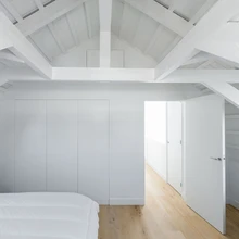 Õhulises interjööris on jõuliseks ja konkreetseks aktsendiks must köögisaar, mis tsoneerib ruumi ja mille taga saab baaripukkidel istuda. Pidulikemaks õhtusöökideks kaetakse pikk laud rõdule avanevate akende ette. Köögisaarega samas mahus seina tagant tõuseb trepp teisele korrusele. Katusealusesse seati sisse kaks magamistuba ja vannituba, tualettruum ning panipaigad. Kogu korruse seovad tervikuks nähtavale jäetud puidust laekonstruktsioonid ja valge värvitoon. Valgeks värvitud talade rustikaalsust täiendavad põrandale valitud laiad tammelauad.