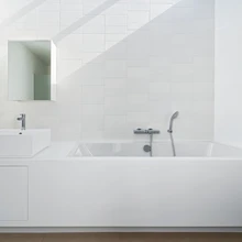 Vannitoas jätkub sarnaste materjalide ja sisseehitatud sisustusega loodud terviklik ruumimulje. Ühtse plokina on kujundatud vann ja valamu, mis on valmistatud vormitavast tehismaterjalist HiMacs. Hommikuvalgusest üleujutatud interjööris hakkavad värsked kontrastid kaunilt kokku kõlama, luues täiusliku tasakaalu väljapeetult minimalistliku stiili ja koduse hubasuse vahel.