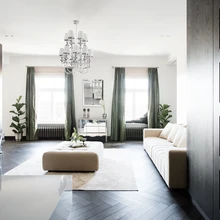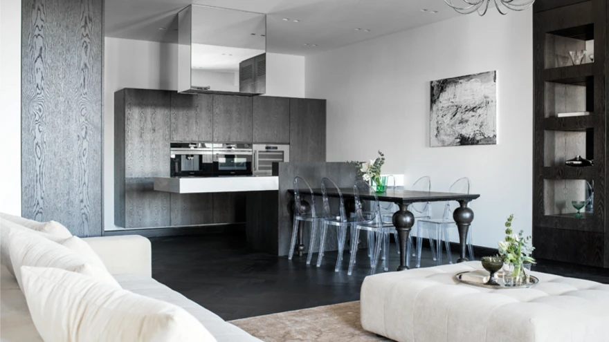 Radiaatorite barokne ornament mängib stiilseks tervikuks kokku Kartelli läbipaistvate, stiliseeritult ajaloolise vormiga toolidega ning põneva vormiga lauajalgadega, mis leiti Eesti tootja Borg valikust. Külluslikku ja pidulikku temaatikat jätkavad erinevad sisustustekstiilid: sametised diivanikatted ja -padjad, siidjad kardinad ning idamaise mustriga viskoosvaibad. Tulemus on pidulikult väärikas ja noobel. Korteriomaniku eelistuse – sooja ja beežika tonaalsuse – asendasid sisearhitektid märksa tumedama ja sügavama värvigammaga. «Armastame interjööris kontraste, kirkad valged seinad ja mustjaspruun spoon mõjuvad siin hästi,» selgitab Maarja. «Kõik kasutatud materjalid on ausad ja ehedad, värvi tõime sisse sügava rohelisega.»