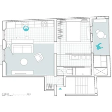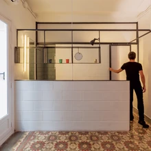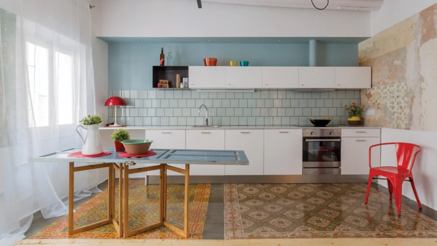Köök on lakooniline ja lihtne. Tume kuubik ülakapirivi vasakul küljel on tuletatud riiulist, mille arhitektid korteri pesuruumi tarvis disainisid. Helesinine värv köögi tagaseinas lisab ruumile värskust. | foto: NookHispaania arhitektuuribüroo Nook tegi renoveerimisprojekti kolmele korterile, mis paiknevad Barcelona Gooti kvartali ajaloolises korrusmajas. Tegemist on üle sajandi vanuse ehitisega, mille ehitusaastaks on 1900. Korter nimega Roc Cube koondab kahe esimesena valminud korteri parimatest parimad ideed.
