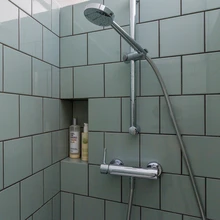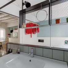 Kuna vana maja korter on põnevalt ebasümmeetriline, soovisid arhitektid sirgjoonelise mööbliga seda tasakaalustada. Horisontaalsed sirged pinnad köögimööbli, laevalgustite ning pesuruumi riiuliraamistiku näol toovad ajaloolisesse interjööri meeldivat konkreetsust.