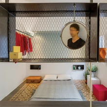 Korteri kahest ruumist teine, hoovi poole jääv magamistuba on elutoaga võrreldes tagasihoidlikum, kuna seal on puutaladest lae asemel kumeravõlviline kivilagi. Magamistuba on ühenduses pesuruumiga, nii et kahte kõnealust ruumi eraldab vaid madal kahhelkivisein. Pesuruumi kraanikausi juurest avaneb vaade magamistuppa. Kraanikausi kohal paiknevad metallkuubikust riiulid, mida saab kasutada nii magamistoas kui ka pesu-ruumis olles. Tualett ja duširuum on magamistuppa avanevast pesuruumist eraldatud lükanduksega. Tualetti pääseb magamistoale lisaks ka esikust – nii ei tarvitse külalistel sinna minnes läbida pererahva magamistuba.