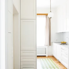 Minimaalne pind on maksimaalselt ära kasutatud ja iga ruutmeeter peidab endas nutikaid lahendusi. «Näiteks on minu jaoks oluline, et saaksin kingi jalga pannes istuda. Kuna tabureti jaoks esikus ruumi pole, ehitasin garderoobikappi väljatõmmatava sahtli, millel võib istuda ja kingapaelu siduda.» Väljatõmmatav on ka söögilaud köögis, mis leiab enamasti kasutust lisatööpinnana. Laua taha mahub istuma kaks inimest ning selleks ootavad kaks klapptooli esikukapis oma korda.