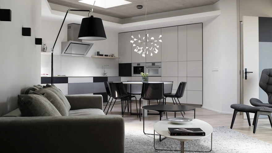 Korter osteti n-ö karbina ja ehituslik pool oli selleks ajaks suuresti paigas, kui Lauri Nõmme interjööri kujundama asus – põrandatel oli parkett, vannitoad plaaditud ja elektriühendused veetud. «Arhitektuurselt polnud võimalik enam midagi muuta, seega tuli kogu mulje luua sisustuse ja materjalidega, et olemasolevad, võib-olla mitte kõige paremad materjalikooslused jääksid tagaplaanile,» selgitab sisearhitekt. Elutoas jäeti siiski nähtavale ehedad betoonlaed, mis aitavad rõhutada interjööri nurgelisust ja konkreetsust. Kuna ukseavasid päris laeni välja kavandada ei õnnestunud, «kasvatati» siseuksed visuaalselt kõrgemaks paneelide abil.