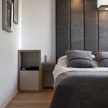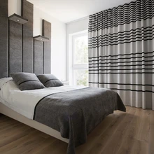Kui arhitektuurses plaanis sisearhitektil suurt mänguruumi polnud, oli seda enam võimalusi keskenduda detailidele – need ongi kogu korteris stiilipuhtalt ja terviklikult välja mängitud. Magamistubades jätkavad monokroomset liini tekstiil- ja 3D-tapeedid, mis peale stiili panustavad ka ruumi akustikasse. Peamagamistoa lopsakatele kardinatele õmmeldi Lauri Nõmme jooniste järgi peale mustad triibud, et halli tekstiili elavdada ja tuba ilmestada. Samuti on spetsiaalselt teha lastud voodi- ja padjakatted ning taas geomeetriast inspireeritud voodi peats. Kõik korteri kardinad, vaibad jt tekstiilid telliti kardinasalongist Smartex Disain.