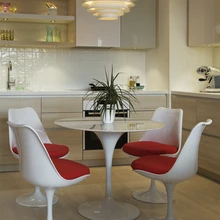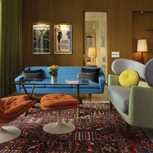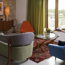 1950ndate lõpus ja 1960ndatel sündis palju tänaseks disainiklassikaks saanust – näiteks Eero Saarineni söögilaud ja toolid köögis – ning mööbli ja valgustite valikul ongi võimalusel eelistatud originaale. Diivanid on küll uued: Oot-Oot Stuudio kollektsiooni kuuluv Cosmo on vaid mõne aasta eest disainitud, autoriteks Joonas Torim ja Marko Ala, teine on 1950ndate diivani koopia.