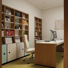Kohe välisukse kõrvale jääv kodukontor on põneva lahendusega ruum, kus seintes aknapindu polegi – on vaid laeaken, mis annab üllatavalt palju valgust ega lase n-ö kapis olemise tundel tekkida. Ruumil pole ka ust, ukseava raamib esiku poolt vaadates puittahveldis ning kabinetti astumine on justkui pildi sisse minek, kus valitsevad pisut teised värvid ja mustrid.