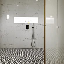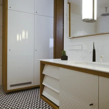Äsja valminud korterelamus ruumiplaani muuta polnud vaja, küll aga tuli pisut siluda korteri kõige suuremasse seinapinda projekteeritud erinevaid tasapindu ja soppe. Puittahvlitega kaetud sein on esiteks ajastu märk ning selle saamine oli peremehe soov algusest peale. Teiseks andis see aga hea võimaluse üsna väikses ruumis suure ühtlase ja efektse pinna loomiseks, mille sisse on peidetud nii vannitoauks kui ka esikukapp.
