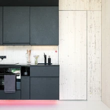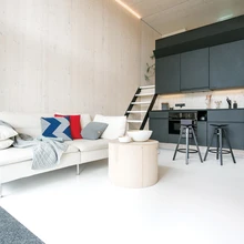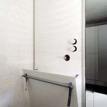 KODA duširuum tekitab esmapilgul kõhklusi, kas uhkete disainielementidega ruum täidab ikka oma otstarvet? Järele proovides toimib kõik mugavalt ja lihtsalt: liigutatava vaheseina abil tekib tualettruumi väike dušinurk. Eriti meeldiv on duširuumi põrand: jala all mõnusalt siidisena mõjuv betoon on mati pinnaga ning takistab märjal põrandal libisemast. Sümpaatne on ka vannitoa valguslahendus, kus kappide taha peidetud valgusallikad valgustavad ruumi kaudselt. Mugavuse lisamiseks võiks duširuumis olla veel riiul šampoonipudelitele.