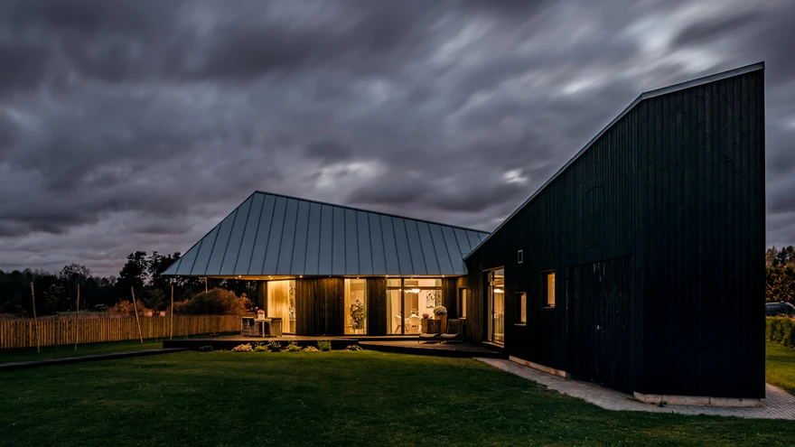 Tumeda puitfassaadiga ühekorruseline eramu paelub huvitava vormimänguga. Kadarik Tüüri arhitektid (Ott Kadarik, Mihkel Tüür, Aleksei Petrov, Tanel Trepp) on origamiga sarnaselt nurki ja servi kokku murdnud ning voltinud, saades tulemuseks põnevalt liigendatud maja. Napp materjalivalik – mustaks värvitud vertikaalne lehiselaudis – toob arhitektuurse lahenduse veel selgemalt esile.