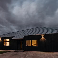 Hoonel on liimpuidust katusekonstruktsioon, põhimahu konstruktiivses osas on kasutatud nii puitu kui ka kivi. Fassaad on kaetud mustaks värvitud vertikaalse lehiselaudisega. | foto: Tõnu TunnelKümmekond aastat tagasi kerkima hakanud elamupiirkond Saue külje all esindab tüüpilist linnalähedast uusasumit, kus vaiksete tänavate ääres seisavad reas rahulike koduõuedega eramud. Üllatav on leida küla servast maja, mis piirkonna pretensioonitu arhitektuuriga kuidagi sulanduda ei püüa. Kadarik Tüür Arhitektide kavandatud eramu on julgelt eristuv ja isepäine.