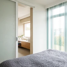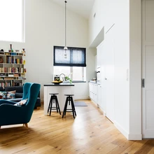 Sisekujundaja ametit pidav perenaine Margit Hansmer on oma kodu kujundades silmas pidanud lihtsust ja selgust. «Mida vähem, seda parem,» rõhutab ta. Põrandaid katab ilus lai tammelaud ja seinad on ühtlaselt valged. Lakoonilist joont jätkavad ka siseuksed, mis on seinaga ühes tasapinnas, ilma piirdeliistude ja liigsete detailideta. Selline vaoshoitud lähenemine õigustab end igati arhitektuurselt keerukas ja ebastandardses ruumis, kus on palju erinevaid kõrgusi ja nurki.
