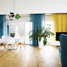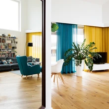 Värvi toovad interjööri sisustus, tekstiilid ja elu ise. Suurem osa mööblist – diivan, tugitool, söögilauakomplekt – pärineb salongidest Vepsäläinen ja BoConcept. Lahtiseid kappe või riiuleid ei tahetudki, kuna asjade hoidmiseks on piisavalt panipaiku ja garderoobe. Tekstiilid – värvilised kardinad ja eritööna valminud diivanipadjad – telliti Smartex Disaini kangasalongist. Loomulikku valgust on suurte akendega elutoas palju, õhtuti aitab aga erinevaid valgusmiljöösid luua peidetud karniisivalgustus või söögilaua kohal rippuv efektne kuppel.