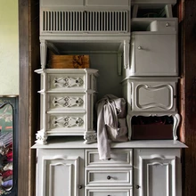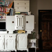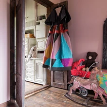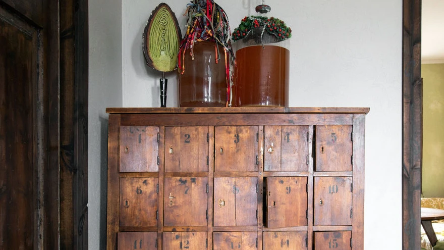 Vanast postkastist sai elutuppa stiilne puhvetkapp. | foto: Terje UgandiTriinu Pungitsa loomingus on salapära ja unenäolisust, see on jõuline ja alati eristuv. Muinasjutuline meeleolu valitseb ka moekunstniku kodus Tartus Karlovas, kus tume puit, sametised seinatoonid ja hämarad nurgad segunevad koos värvikate detailidega boheemlikuks virvarriks.