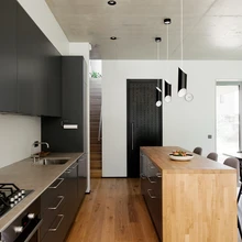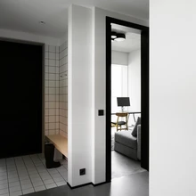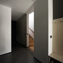 Liisa sõnul arvestati kujunduses palju sellega, et peres on kaks väikest last ja koer. Hoovipoolse sissepääsu juurde kavandati majapidamisruumid ja väike pesukoht koera käppade ning poriste kummikute pesemiseks. «Majapidamisruumid moodustavad koos peasissepääsuga terviku ja on maja ühendav element,» lisab sisearhitekt.
