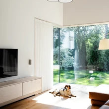 Kui ülejäänud tubades on ruumile lähenetud pigem säästlikult, siis elutuba kavandati läbi kahe korruse ulatuva kõrge ja avara ruumina. Et suure klaasseina ja õhuaatriumiga tuba liiga kajama ei hakkaks, kasutati akustilise elemendina teise korruse tasandil puitribidest seina, mille taha on peidetud helineelav materjal. Ribimotiiviga on maja väline arhitektuurikeel kenasti ka sisekujundusse edasi kandunud. Samuti sobis see väikese siseakna ideega – elutoa aatriumisse avaneb sõrestiku taha varjatud teise korruse vannitoa siseaken.