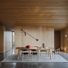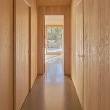 Maja telgikujulisest arhitektuurist ja katuse vormist tingituna on elutoa kergelt kaarduvate lagede kõrgus kohati lausa sakraalsed kuus meetrit. Üüratut mastaapi pehmendab sooja üldmuljega saarepuidust laudis, mis katab seinu, lagesid ja mööblipindu. Pikk ja toekas söögilaud Bull (B&B Italia) jätkab meeldiva puidususe teemat ning hallid betoonpõrandad, vaibad ja diivanid-tugitoolid (samuti B&B Italia) loovad oma tonaalsuses paralleele kaljumaastikuga akende taga. Maja interjöör on elegantselt ja väljapeetult lakooniline, justkui tõmbudes ürgse looduse ja erilise arhitektuuri ees delikaatselt tagasi.