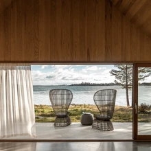 Katuse ekspressiivsest vormist tulenevalt ulatub elutoa kõrgus kohati kuue meetrini. Hallides toonides sisustus kõlab kokku akende taga laiuva kaljumaastikuga. Patricia Urquiola diivan Tufty-Time ja Naoto Fukasawa tugitoolid Papilio. | foto: Salva Lopez; Åke E:son LindmanStockholmi saarestikus Krokholmenil asuv moodne suvekodu kannab väärtusi, mis tõstavad esile looduse ilu ja loovad ühtlasi suurepärase keskkonna lõõgastumiseks ning ümbritseva nautimiseks. Maja autorid on Tham & Videgårdi arhitektid.