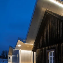Tutvustage palun valguslahendust. Mulle jäid silma piki murdepunkte paigutatud valgustid, mis annavad hoonele visuaalselt kergust ning eraldavad seinu katusest.