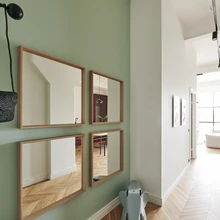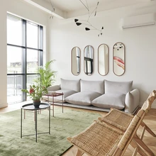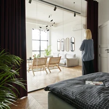 Sisearhitekti sõnul aitavad kunsti asemel seinu ehtida ka näiteks värvilised peeglid. Siingi on elutoa- ja esikuseinal gruppidesse sätitud ovaalsed ning kandilised peeglid, mis mõjuvad meeleolukamalt kui üks suur peegelpind. Kuna köök asub elutoast eraldi, oli ruumi tekitada elutuppa mõnus diivani ja tugitoolidega istumisgrupp. Sohva valmistas spetsiaalselt selle ruumi jaoks Sofaservice ja kerged rotangtugitoolid tulid Hunteriori salongist. Hea planeering ja sobiv mööblivalik jätab avarasse ning kõrgesse korterisse küllaga hingamis- ja tegutsemisruumi.