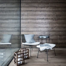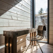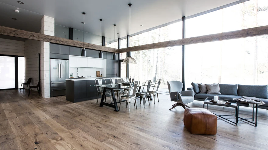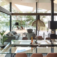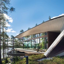 Eramu Wave. Suured aknapinnad seovad välisruumi sujuvalt siseruumiga. Interjööri materjali- ja värvivalik on kooskõlas maja ümbritseva kauni loodusega. Tammeparketile sekundeerivad lae all kulgevad samas toonis puidust talad. | foto: Tommi Hynynen / Tommi Hynynen PhotographySuvel toimunud Soome elamumessil Mikkelis äratas enim tähelepanu lennuka vormiga eramu Wave. Palkkonstruktsiooniga maja esindas ennenägematut ja ambitsioonikat arhitektuuri, kus puumaterjal paindub kaarjateks vormideks.