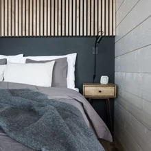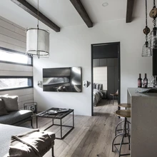 Maja omanikud on ettevõtlik ja sportlik paar, kes sisustasid oma kodu koostöös sisekujundaja Maija Puhakaineniga. Interjööri värvigamma on neutraalne ja karge, viimistlusmaterjalid naturaalselt jõulised. Põrandat katab väärikas tammeparkett ning seinamaterjalidena on kasutatud kas tumedaks või heledaks viimistletud palki. Mõned seinad on siledad ja valgeks värvitud. Tähelepanu väärib pingutatud kangast lagi. Suur osa interjööris kasutatud mööblist pärineb firmast A&A Design. Ettevõte tegeleb kodude sisustamise kõrval ka avalike ruumide – restoranide, kohvikute, baaride sisustamisega ja firmal on ka internetipood. Pisut industriaalihõnguline mööbel ja valgustid haakuvad kenasti maja Wave jõulise interjööriga, selle üle mingil viisil domineerimata.
