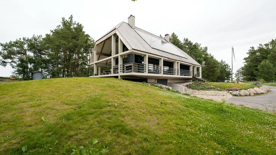Massiivse kelpkatusega maja on asetatud loodusliku künka otsa, jättes konsoolidena eenduvad betoonterrassid maapinnast lahti. Moodne, õhuliselt mõjuv betoonskelett toetab omakorda eluruumide liimpuidust konstruktsiooni ja taluarhitektuurile viitavat lehisest laudkatust. «Madalad räästad ja katusealused terrassid varjavad eluhoone tegelikku mahtu ning rõhutavad veelgi vanale rehielamule iseloomulikku madalust,» kirjeldavad arhitektid valminud lahendust. Katuseräästad ulatuvad eluruume ümbritsevate terrasside kohale ning pakuvad varju nii sise- kui ka välisruumis. Abihooneid mereäärsele krundile ei planeeritud, kuid tänu pinnareljeefile ja sellele, et maja seisab künka otsas, õnnestus selle alla ära peita majapidamises tarvilikud keldriruumid.
