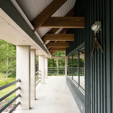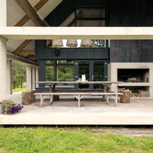 Õhtupäikesepoolsele terrassile õuekamina kõrvale on sisse seatud väike väliköök. Istumisnurki leidub tervet maja ümbritseval terrassil teisigi ja olenevalt päikese liikumisest ning tuule suunast võib end igas maja küljes mõnusalt istuma ja loodust vaatama sättida. Siinsamas maja kõrval algavad rahvuspargi metsarajad, mõnesaja meetri kaugusele jääb mererand, kus mõned rannaküla kalurid käivad veel praegugi võrke vette laskmas. Suvekodu omanikel pole plaanis piirdeaia püstitamise või iganädalase muruniitmisega looduskaunist paika «kodustada», pigem lubatakse loodusel avaral krundil vaikselt peale tungida ning tulevikus mõnusa metsaalusena toimida.