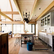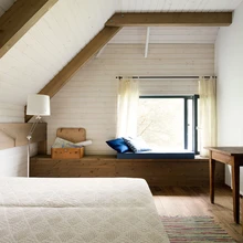 Loodusliku künka otsas «istuva» maja domineeriv maht on arhailisusele viitav lehisest laudkatus. | foto: Terje UgandiLahemaa rahvuspargi serval väikeses rannakülas asuv suvemaja kujutab endast moodsat tõlgendust traditsioonilisest rehemajast. Lihtsa vormiga ja naturaalsetest ehitusmaterjalidest hoone (arhitektuur Kadri Soe ja Hillar Mänd) sobitub sümpaatselt ümbritsevasse rannamaastikusse.