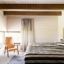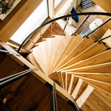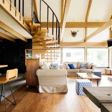 Maja esimesel korrusel paiknevad avatud köögiga elutuba, peamagamistuba ning sauna- ja tualettruumid; köögi kohal asuval poolkorrusel on ruumi veel avatud kabinetile ja kahele magamistoale. Kahte tasandit ühendab interjööri pilkupüüdvaim detail – liimpuidust trepp, mille astmed on klotsidena keerdtrepiks laotud. Kuna trepp pidi mahtuma täpselt kahe tala vahele, oli sobiva mahu ja vormi kavandamine arhitektidele paras pähkel, aga kaunis tulemus oli vaeva väärt.