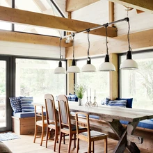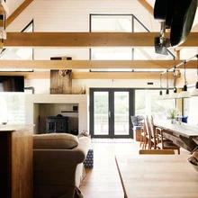 Seitse meetrit kõrges elutoas on jäetud nähtavale liimpuidust sõrestik ja talad ning tänu ruumi ääristavatele akendele on elutuba valgusküllane ja avar. Eriti talvel, mil päike käib madalama kaarega, on tuba valgust täis. Suvel kaitsevad madalad räästad aga eluruumi keskpäevase terava päikese eest ja lasevad tuppa pehme õhtukuma.