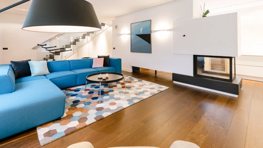 Interjööris valitsevad sinised toonid on perenaise enda valik. «Praegu on see mu lemmikvärv, ehkki olen hakanud märkama ka sinepitoone, kollase varjundeid.» Sellesse perfektselt sobivad Rõugu maalid leidis aga sisekujundaja. «Pere olemasolev vanema kunsti kogu oli hea ja päris suur,» ütles Helen Kolks, «ja mulle endale meeldib tegelikult eklektika ja erinevaid stiile omavahel kokku sobitada. Aga neid varem olemasolevaid töid ei õnnestunud kahjuks kuidagi sinna interjööri paigutada.» Nii on mitu seina majas alles tühjad ja neile sobivaid teoseid alles valitakse. Näiteks teise korruse magamistuppa voodi kohale otsivad nad samuti nüüdisaegsemat mustvalget fotot või graafikat.