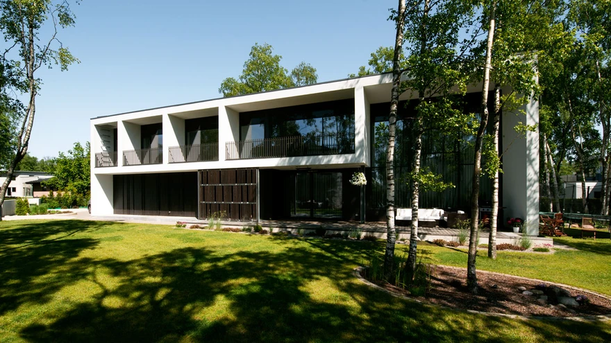 Kuna pererahvale oli sümpaatne nende eelmisest majast tuttav Aeroc, tehti ka uus kodu samast materjalist. «Aeroc ei vaja soojustamist ja see teeb mõneti töö lihtsamaks,» selgitab arhitekt. Maja aknaid on käsitletud modernistlikul viisil – need on valdavalt ruumisuurused ja aknalaudadeta. Klassikalist akent, mis algab kõhukõrguselt, majas polegi. Teisel korrusel on igal toal oma privaatne rõdu, kuhu pääseb lükanduste (-akende) kaudu. Lükandukse kaudu saab minna ka köögi ja elutoa ees laiuvale terrassile. «See oli abikaasa ettepanek, et köögi põrand ja terrass oleksid ühes tasapinnas,» sõnab naine. «Kui lükanduks/aken on lahti, «sirutabki» köök ennast terrassile, kuhu mahub 25 inimest mõnusalt aega veetma. Ülemise korruse rõdu kaitseb terrassi osaliselt vihma eest.»