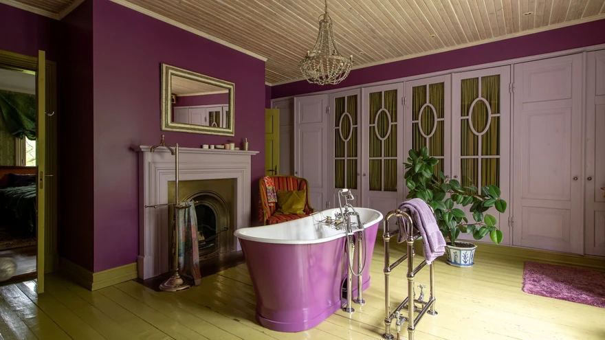 Teisel korrusel asuvas kaminaga vannitoas on julgeid värve ja võluvat avarust. | foto: Terje Ugandi20. sajandi algusaastate piltpostkaardilik suvitushäärber Tabasalus on taktitundeliselt uuele elule äratatud, pakkudes nii tänapäevaseid mugavusi kui ka imetlemiseks kadunud aegade hiilgust.