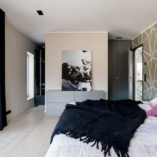 Suur magamistuba on niigi vaikse tänava ääres seisva maja kõige vaiksemas osas. Tumedad päevakardinad loovad ka keset päeva rahuliku ja sumeda meeleolu. Magamistoa ühe seina taha jääb garderoob, eraldi sissepääs on siit ka privaatsesse vannituppa, kuhu lapsed ei satu.