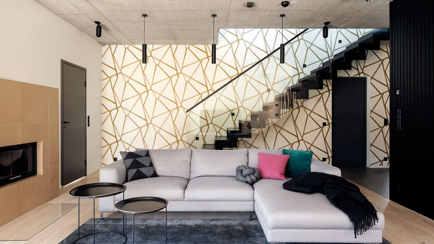 Läbi kahe korruse, kohati viie meetri kõrgune sein otsustati katta efektse, justkui pintsliga tõmmatud pärlmutriste kuldsete triipudega tapeediga. Tapeet on omakorda lakitud, et see väga käidavas kohas liiga kiirelt ei määrduks. | foto: Terje UgandiNeljaliikmeline perekond teadis uue kodu rajamiseks sobivat krunti otsima hakates algusest peale, et see peab tulema senisest korterist avaram, väga energiasäästlik ja kindlasti puuküttega saunaga. Unistuste kodu loomisel kutsuti appi sisearhitekt Annika Lill.