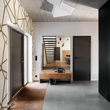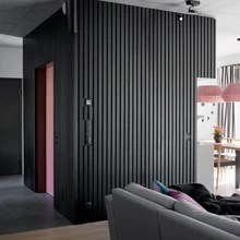 Muutuseid tuli teha ka esteetilistel kaalutlustel. Esialgu oli arhitekt elutoa ja köögi osasse joonistanud kandvad talad, kuid peremees oli veendunud, et neid talasid ta endale koju mitte mingil juhul ei taha, ning ette tuli võtta päris kulukas vahelae ümberprojekteerimine. Koostöös sisearhitektiga tekkis idee sileda eheda betoonvahelae eksponeerimiseks. Pealegi, kui ühe laega on nii palju tööd tehtud ja selle alla hulk raha pandud, tuleks seda ka näidata. Puhas, pisut industriaalse olemusega betoon lihtsalt nõudis tasakaaluks haakuvaid pehmemaid nüansse: üldist heledat taustatooni, naturaalset puitu ja looduskivi meenutavat plaati. Ruumikujundamisel otsustas sisearhitekt kasutada halli betooniga haakuvaid musti tehnilisi valgusteid ja pistikupesi. Huvitavat nüansirikkust sai lisatud modernsete-rustikaalsete nöörist valgustitega. Ruumi keskel paiknev garderoobimoodul kaeti šiki musta laudisega. Ka pehme pastelne roosakas toon on jahedale hallile ja salapärasele mustale hea partner.